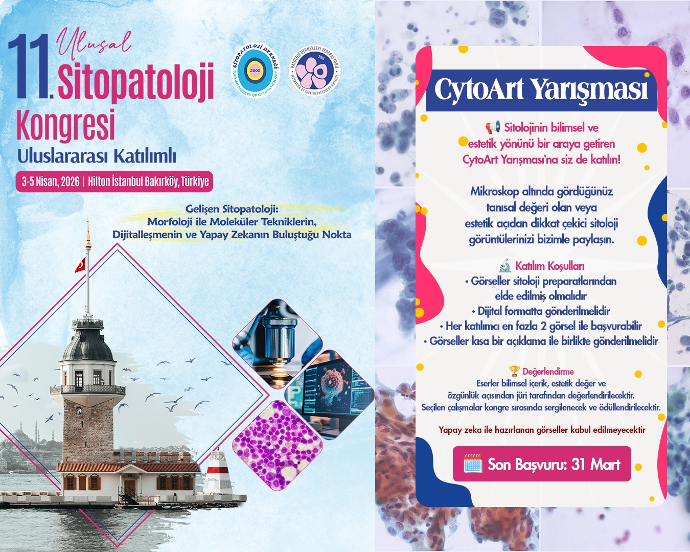 Sizleri Türk Sitopatoloji Derneği ve Patoloji Dernekleri Federasyonu adına, 3–5 Nisan 2026 tarihleri arasında, İstanbul’da gerçekleştirilecek olan Uluslararası Katılımlı 11. Ulusal Sitopatoloji Kongresi'ne davet etmekten büyük onur ve mutluluk duyuyoruz. Sitopatoloji alanı; moleküler tanı, dijital uygulamalar, yapay zekâ ve bütünleyici yaklaşımlardaki gelişmelerle birlikte hızla ilerlemekte ve hasta bakımındaki rolümüzü önemli ölçüde güçlendirmektedir. Bu kongre, söz konusu yenilikleri yansıtan kapsamlı bir bilimsel programın yanısıra, günlük uygulamada karşılaşılan zorluklara da ışık tutmayı hedeflemektedir. Uluslararası alanda tanınmış uzmanlar, konferanslar, sempozyumlar, çalıştaylar, kurslar ve interaktif oturumlar aracılığıyla bilgi ve deneyimlerini paylaşacak; böylece tüm katılımcılar için zengin bir akademik ortam sağlanacaktır.